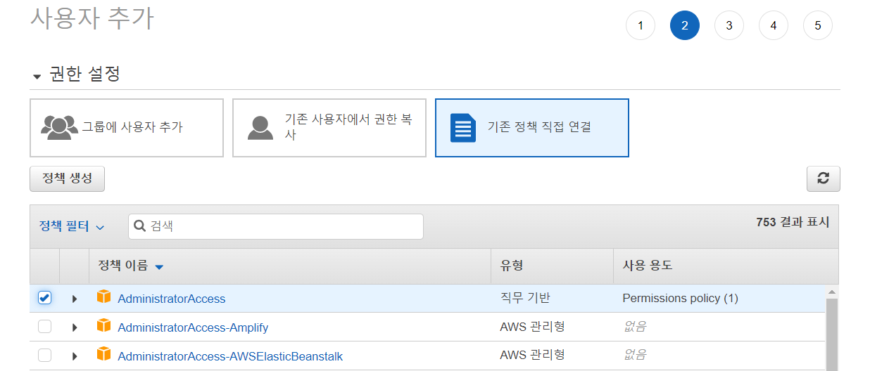 다음으로 권한을 AdministratorAccess 를 선택해준다.