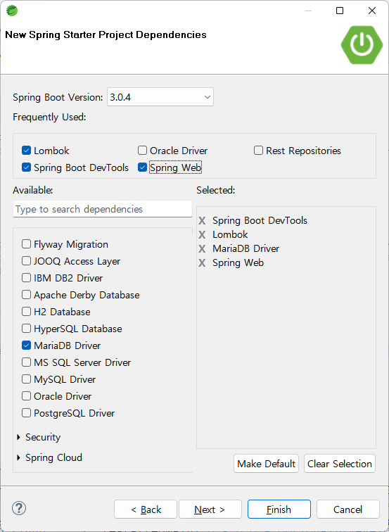 dependency는 대충 Lombok, SpringBootDevTools, SpringWeb, MariaDB Driver 정도 체크하고 Finish를 눌러준다.