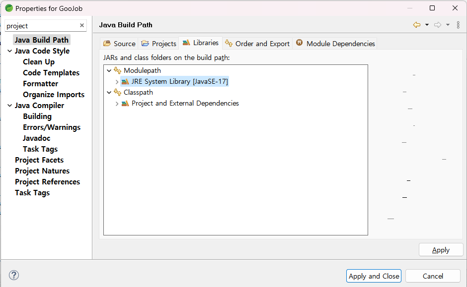 프로젝트 우클릭 - properties 에서 jre 버전을 확인해보니 17로 되어있다.